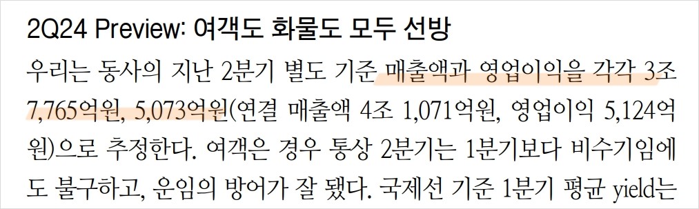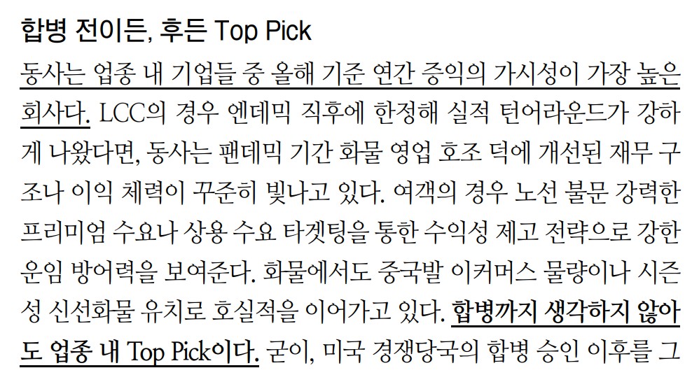 대한항공은 합병 전이든 후든 Top Pick임. 여객과 화물 모두에서 좋은 실적을 기록하고 있으며, 향후 주가 상승이 기대됨. 확실히 실적이 좋기도 하고 한국에서 유일한 항공사이긴 한데, 땅콩의 이미지가 너무 강해서 ㅋㅋ 손이 안가는건 맞음. 투자 의견은 "매수"를 유지함.