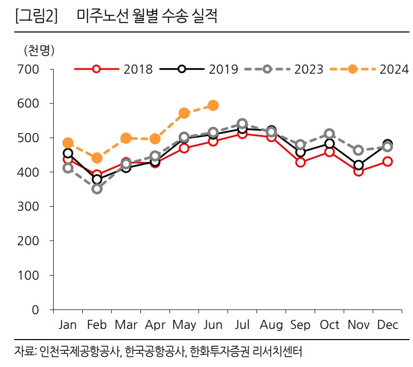 대한항공은 최근 2분기 실적에서 시장 기대치를 상회하는 성과를 냄. 여객 운임 방어와 미주 및 중국 노선의 강한 수요가 주요 요인임. 화물 운임도 상승세를 보임. 미국 경쟁당국의 합병 승인 이후, 대한항공의 영업력은 더욱 강화될 것으로 전망됨.