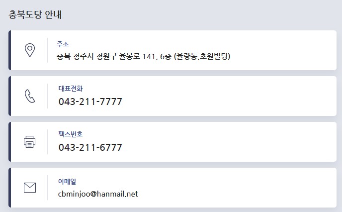 더불어민주당 충북도당 고객센터 전화번호는 위와 같습니다. 문의사항이 있을 경우 더불어민주당 충북도당 고객센터 전화번호 '043-211-7777'로 연락하시면 됩니다. 전화번호가 변경될 수 있으니, 정확한 정보를 위해 공식 홈페이지에서 최신 정보를 확인하시기 바랍니다.