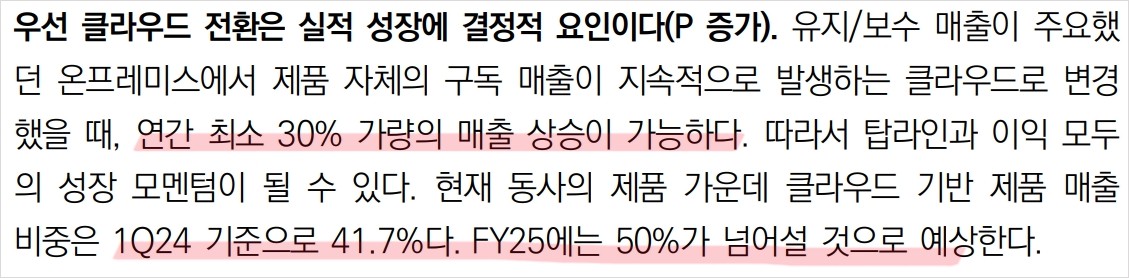 A. 현재 클라우드 기반 제품 매출 비중은 2024년 1분기 기준 41.7%이며, FY25에는 50%를 넘을 것으로 예상됩니다.