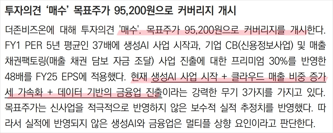 더존비즈온의 주가는 클라우드 전환과 생성AI 도입으로 인해 긍정적인 전망을 보이고 있음. 클라우드 매출 비중이 지속적으로 증가하며, 생성AI 사업이 본격화되면 매출과 이익 모두 상승할 것으로 예상됨. 또한, 기업 CB와 매출 채권 팩토링 사업 진출로 추가적인 성장 가능성 있음.