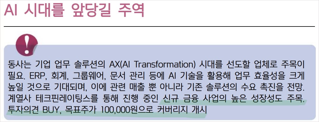 더존비즈온은 AI 기술을 적극적으로 도입하여 기업 솔루션 시장에서의 입지를 강화하고 있음. ERP, 회계, 그룹웨어 등 다양한 솔루션을 통해 매출 성장을 이루고 있으며, 신규 AI 솔루션 출시로 추가적인 수익 창출이 기대됨. 또한, 자회사를 통한 금융 사업 확장으로 미래 성장 가능성이 높음. 이에 따라 더존비즈온의 주가는 긍정적인 흐름을 보일 것으로 전망됨.