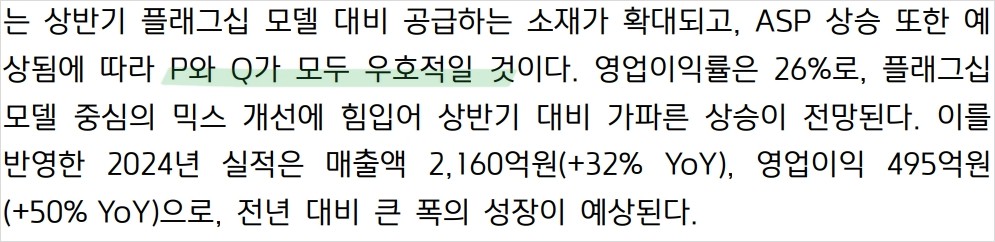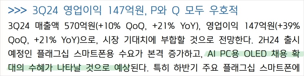 덕산네오룩스는 최근 갤럭시 S24 시리즈와 A 시리즈 출시 효과로 매출이 증가했으나, 중저가 제품 비중 확대에 따른 믹스 변화로 영업이익은 시장 기대치를 소폭 하회할 전망임. 2H24는 플래그십 스마트폰 출시와 AI PC용 OLED 채용 확대의 수혜가 예상됨. 또한, OLED 아이패드 및 AI PC를 비롯한 IT OLED 시장 성장의 수혜가 예상되며, 폴더블 기기 적용 확대와 8.6세대 IT OLED 신규 라인 가동이 주요 성장 동력이 될 것임.