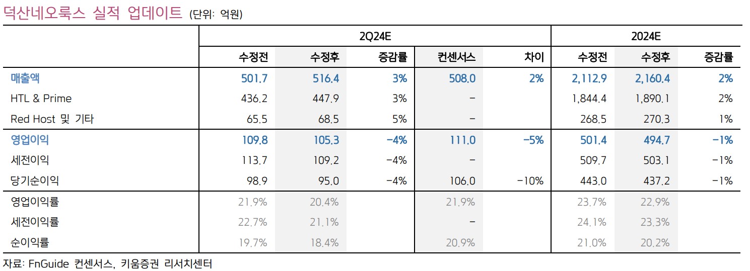 덕산네오룩스는 OLED 소재 전문 기업으로, IT OLED 시장 성장의 최대 수혜 업체로 부각될 전망임. 최근 실적이 시장 기대치를 소폭 하회했으나, 하반기 플래그십 스마트폰 출시와 AI PC용 OLED 채용 확대의 수혜가 예상됨. 덕산네오룩스는 높은 성장 잠재력을 가진 기업으로, 장기적인 투자 매력이 큼. 주가 목표는 60,000원으로 설정되었으며, 이는 현재 주가 대비 약 50% 상승 여력이 있음.