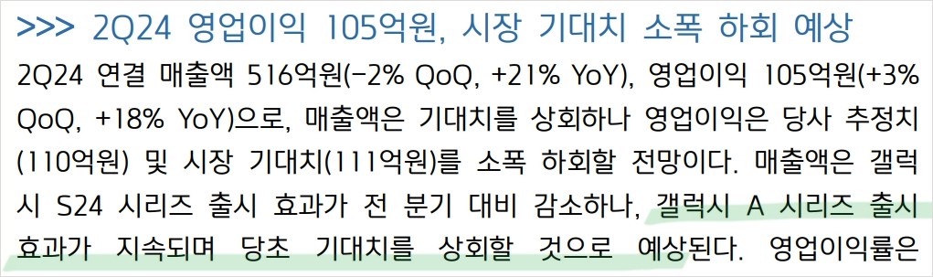 - 2024년 2분기 영업이익은 105억원으로 예상됨.