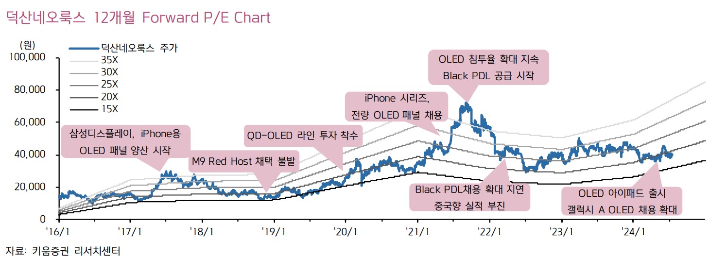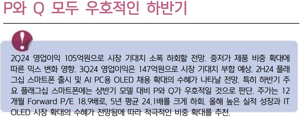 덕산네오룩스는 OLED 소재 전문 기업으로, 주로 스마트폰 및 TV에 사용되는 OLED 소재를 생산하고 있음. 2024년 2분기 영업이익은 105억원으로 시장 기대치를 소폭 하회할 전망이나, 하반기 플래그십 스마트폰 출시와 AI PC용 OLED 채용 확대의 수혜를 받을 것으로 예상됨. 덕산네오룩스는 IT OLED 시장 성장의 최대 수혜 업체로 부각될 전망. 주가는 현재 12개월 Forward P/E 18.9배로, 5년 평균 24.1배를 크게 하회하고 있어 저평가된 상태임.