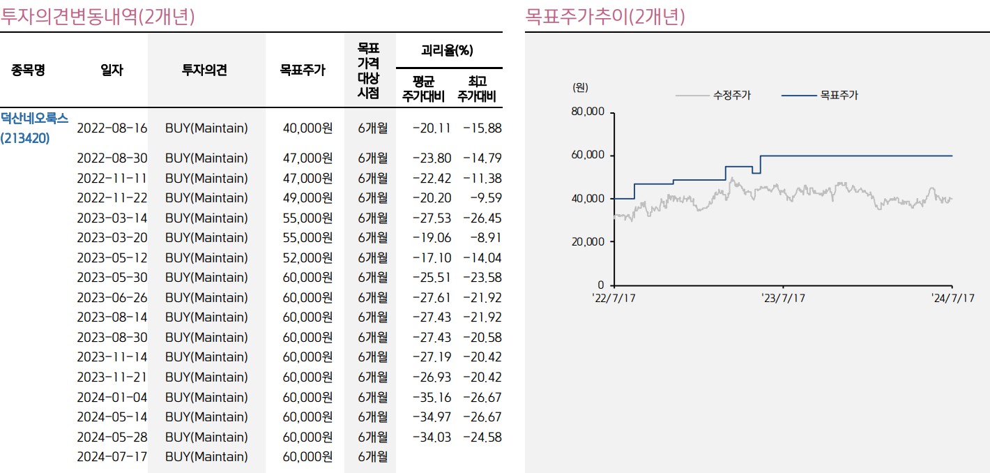 덕산네오룩스의 목표주가는 12개월 내 60,000원으로 설정됨. 이는 현재 주가 대비 약 50% 상승 여력이 있는 수치임. 덕산네오룩스는 성장 잠재력이 높아 장기적인 투자 매력이 큼.