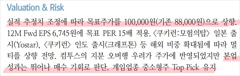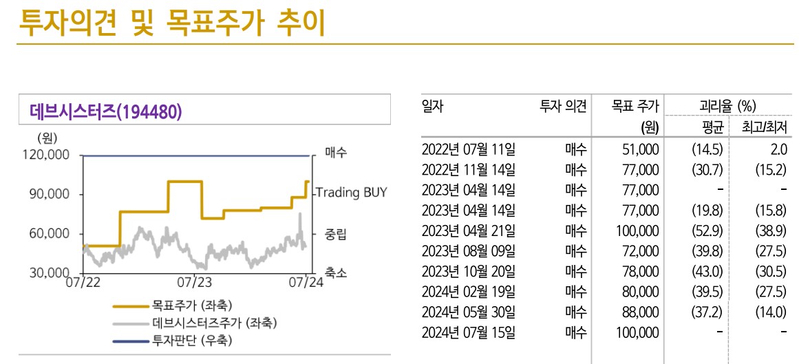 데브시스터즈의 목표주가는 100,000원으로 설정됨. 이는 현재 주가 대비 상당한 상승 여력을 가짐.