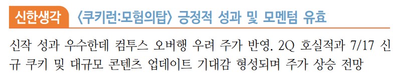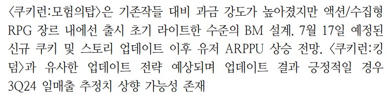 데브시스터즈는 2024년 2분기 실적에서 주요 게임들의 성과가 긍정적으로 작용함. 특히, '쿠키런:모험의탑'이 출시 이후 9일 만에 100억원 매출을 기록하며 큰 성과를 냄. 또한, 7월 17일 예정된 신규 쿠키 및 대규모 콘텐츠 업데이트가 기대를 모으고 있음. 주요 게임의 업데이트 전략이 긍정적인 영향을 미칠 것으로 보임.