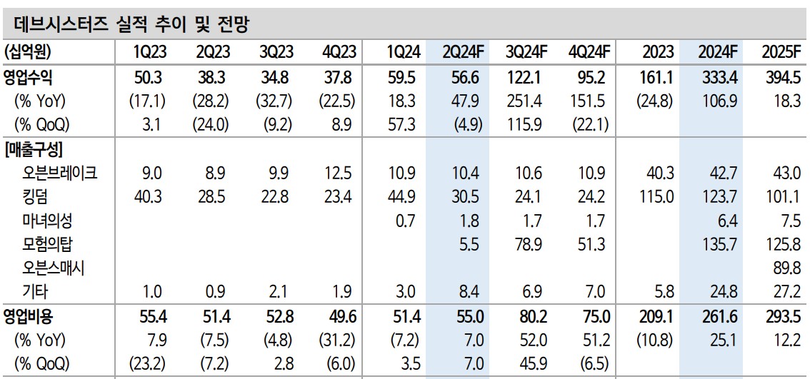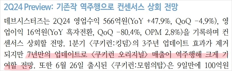 데브시스터즈는 2024년 2분기 영업수익 566억원(YoY +47.9%, QoQ -4.9%), 영업이익 16억원(YoY 흑자전환, QoQ -80.4%, OPM 2.8%)을 기록하며 컨센서스를 상회할 전망임. 주요 게임인 '쿠키런:킹덤'과 '쿠키런:오리지널'의 실적 개선이 주요 요인임.
