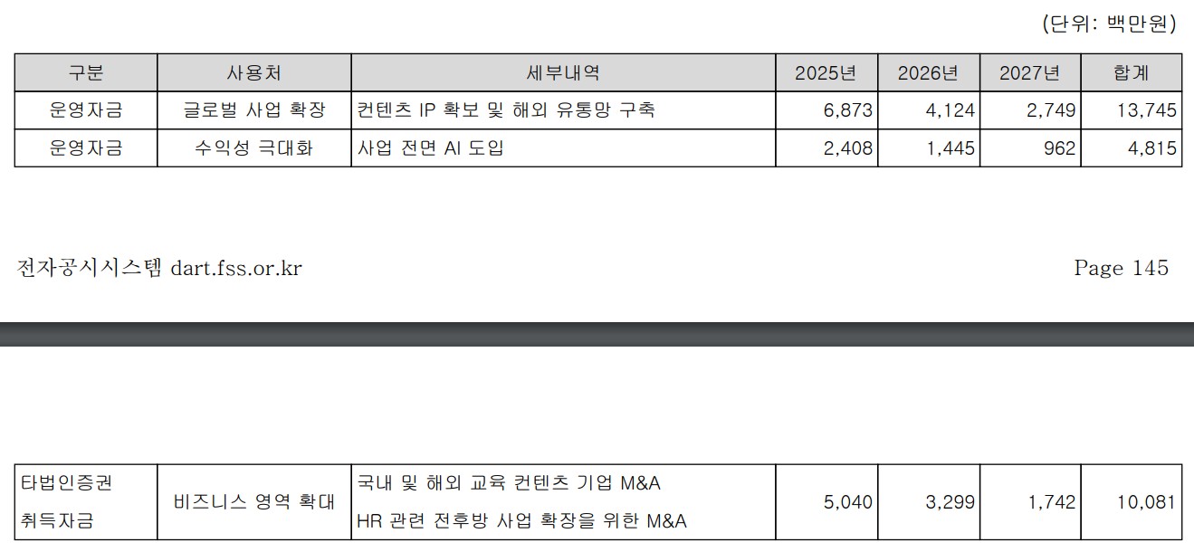 3. 연구개발(R&D) 투자: 약 50억 원을 AI 기반 학습 플랫폼 개발 및 콘텐츠 제작 시스템 고도화에 사용할 예정입니다.