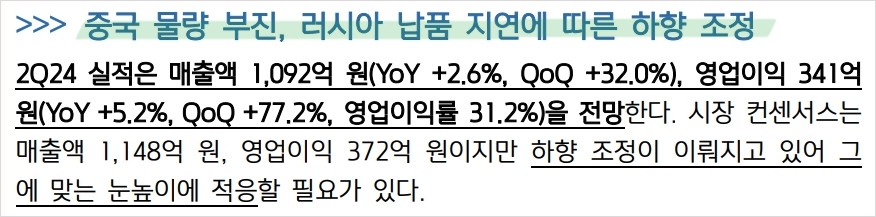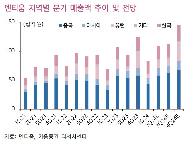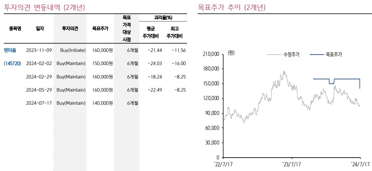 덴티움은 치과용 임플란트 제조업체로, 2024년 2분기 실적은 매출액 1,092억 원, 영업이익 341억 원을 기록할 전망임. 주요 고객사는 중국, 유럽, 한국으로 구성됨. 중국 시장에서의 완만한 회복세와 러시아 출하 물량 지연으로 인해 매출 성장세는 다소 둔화될 전망. 목표주가는 140,000원으로 설정됨.