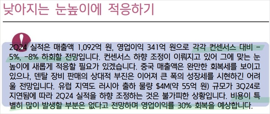 덴티움의 2분기 실적은 예상보다 다소 낮을 것으로 보임. 중국과 러시아 시장에서의 매출 지연이 주요 요인임. 국내 시장 점유율은 증가하고 있지만, 전체 매출에는 큰 영향을 미치지 못함. 영업이익률은 약 31.2%로 예상되며, 이는 비용 관리가 잘 이루어지고 있음을 나타냄.