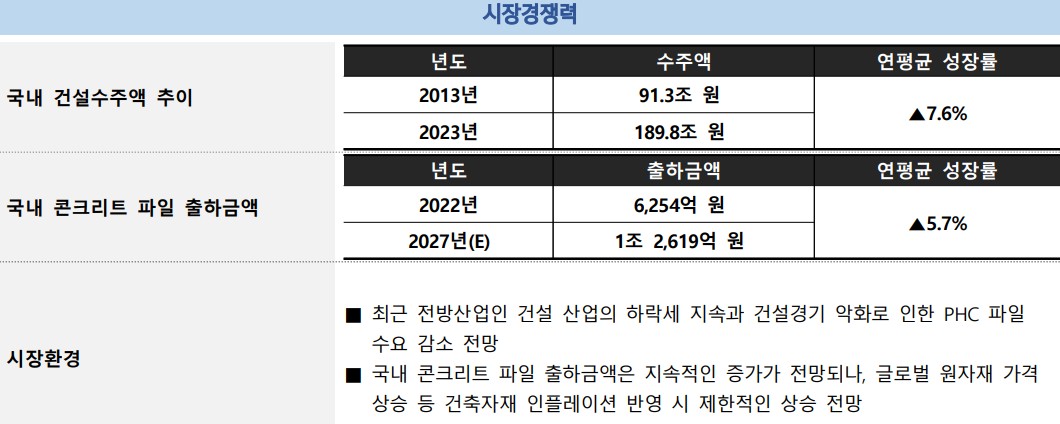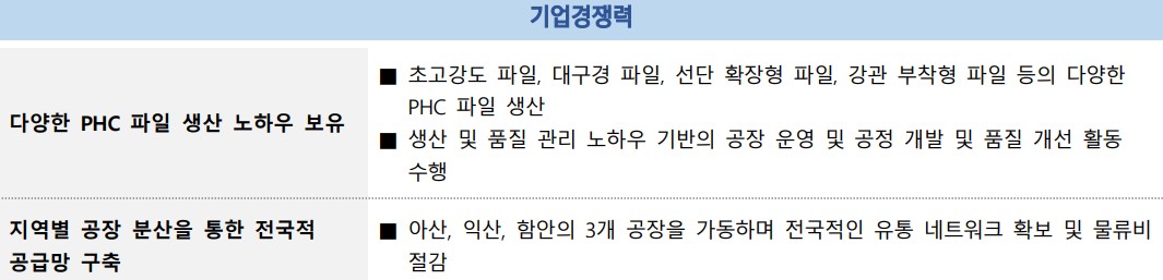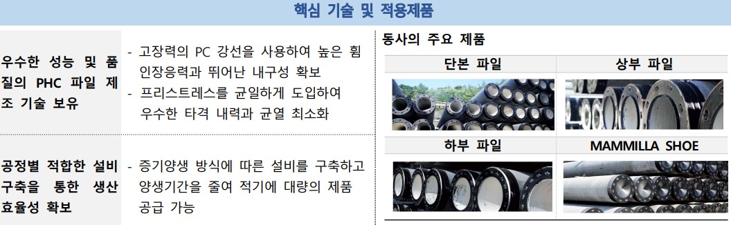 동양파일은 PHC 파일 제조 분야에서 강력한 경쟁력을 보유한 기업임. 고강도 제품을 기반으로 한 생산 효율성과 전국적인 공급망을 통해 고객의 다양한 요구에 신속하게 대응하고 있음. 최근 건설경기 부진에도 불구하고 안정적인 수익성을 유지하고 있는 점이 긍정적임.