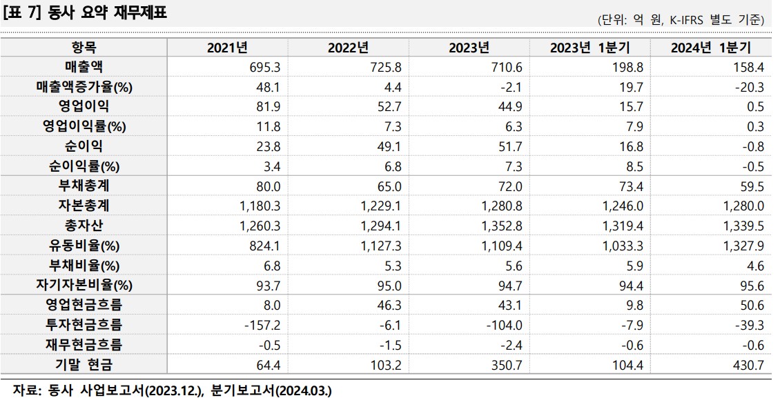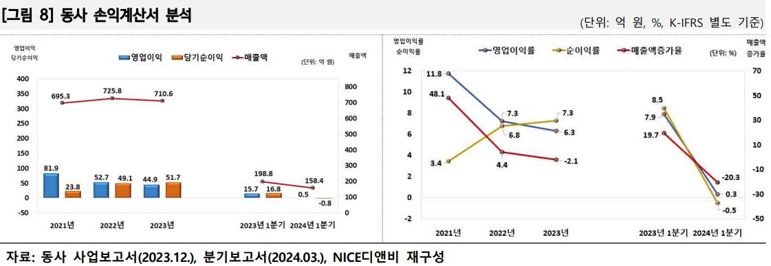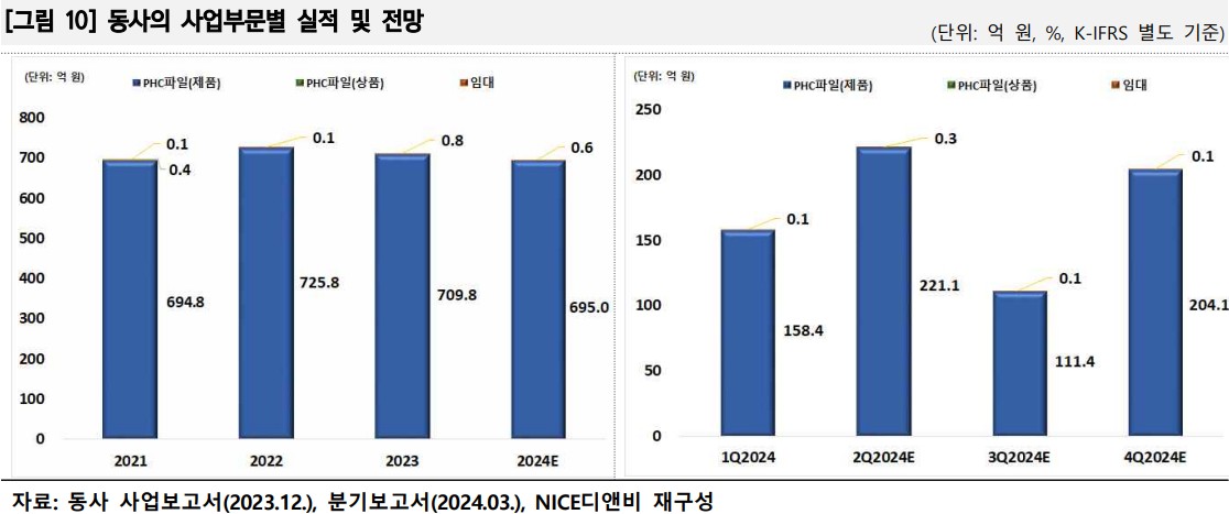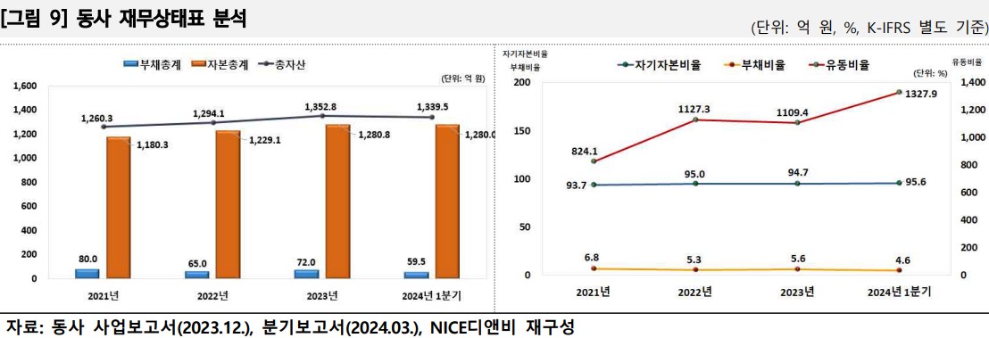 동양파일은 2022년부터 매출 성장세가 둔화되었으나, 최근 3년간 양호한 수익성을 유지하고 있음. 2021년에는 건설경기 회복과 PHC 파일 공급 부족으로 매출이 급성장하였으나, 2022년과 2023년에는 건설경기 부진으로 매출이 정체되거나 소폭 감소함. 그러나 동사는 효율적인 원가 관리와 영업 외 수익 증가로 안정적인 수익성을 유지하고 있음. 2024년 1분기에도 매출 감소와 판관비 부담 증가로 영업이익이 감소했으나, 재무 구조는 여전히 안정적임.
