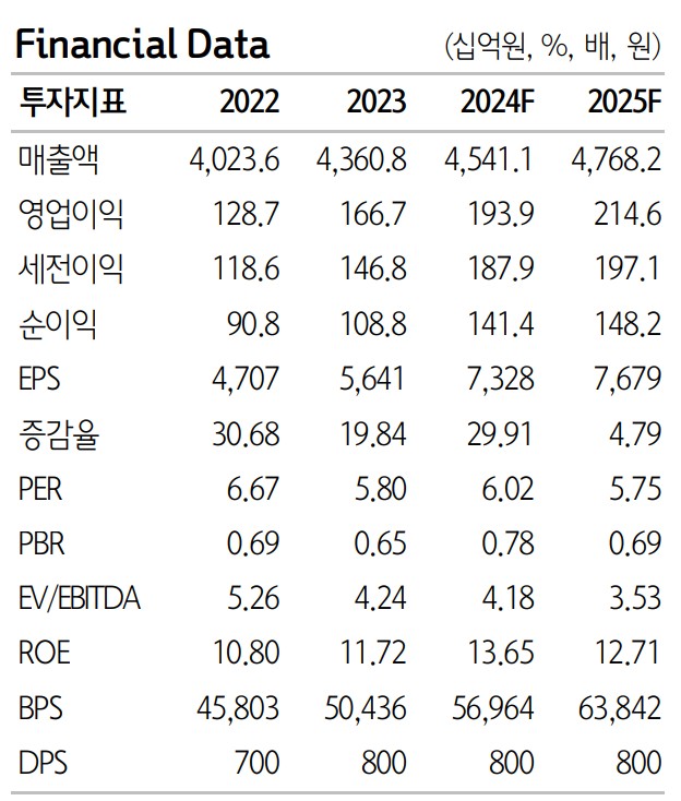 동원F&B의 재무상태는 안정적이며, 2023년과 2024년에 걸쳐 영업이익이 크게 증가할 것으로 예상됨. 2024년 매출액은 4,541억원, 영업이익은 193.9억원으로 예상되며, 이는 전년 대비 각각 4.1%, 16.3% 증가한 수치임. 특히 참치 투입 어가의 하락으로 인해 원가 절감 효과가 크며, 이는 영업이익 개선에 크게 기여할 것임. 동원홈푸드의 경우 급식 향 식자재 수주가 지속적으로 증가하며 매출과 이익에 긍정적인 영향을 미칠 것으로 보임. 이러한 요인들로 인해 주가는 긍정적인 흐름을 보일 가능성이 높음.