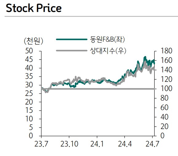 동원F&B의 주가는 앞으로도 긍정적인 흐름을 보일 것으로 예상됨. 급식 향 식자재 수주 증가와 함께 영업이익이 개선될 전망임. 글로벌 어가 하락세와 관련하여 참치 투입 어가의 하락이 원가 절감에 크게 기여할 것임. 이로 인해 회사의 비용 구조가 개선되며, 주가 상승 가능성이 높아짐. 목표 주가는 60,000원으로 제시됨. 이는 현재 주가 대비 41% 상승 여력이 있는 수치임. 금리 인하와 원재료 가격 안정화 등의 긍정적인 요인들이 주가 상승을 이끌 것으로 예상됨.