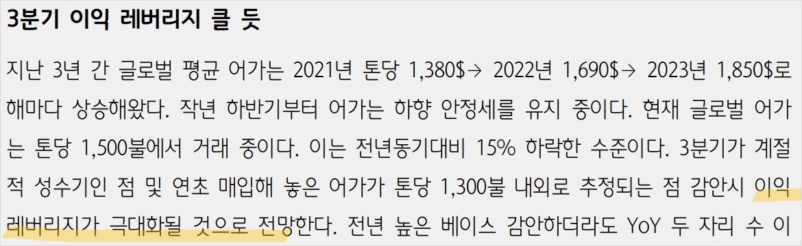 동원F&B는 최근 급식 향 식자재 수주가 양호하여 매출 증가가 예상됨. 동원홈푸드는 YoY 5% 증가할 것으로 보이며, 이는 급식 시장의 지속적인 성장과 연관이 있음. 또한, 참치 투입 어가의 하락으로 인해 원가 부담이 크게 줄어들어 영업이익이 개선될 전망임. 글로벌 어가의 하락세가 이어지며 3분기 이익 레버리지가 극대화될 것으로 보임. 이러한 원가 절감 효과는 김 등 다른 원재료의 상승 부담을 상쇄할 수 있을 것으로 예상됨. 글로벌 어가 하락은 회사의 비용 구조를 개선하는 데 긍정적인 영향을 미칠 것으로 보임.