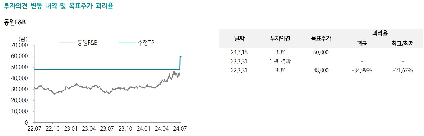 동원F&B의 주가는 앞으로도 긍정적인 흐름을 보일 것으로 예상됨. 급식 향 식자재 수주 증가와 함께 영업이익이 개선될 전망임. 글로벌 어가 하락세와 관련하여 참치 투입 어가의 하락이 원가 절감에 크게 기여할 것임. 이로 인해 회사의 비용 구조가 개선되며, 주가 상승 가능성이 높아짐. 목표 주가는 60,000원으로 제시됨. 이는 현재 주가 대비 41% 상승 여력이 있는 수치임. 금리 인하와 원재료 가격 안정화 등의 긍정적인 요인들이 주가 상승을 이끌 것으로 예상됨.