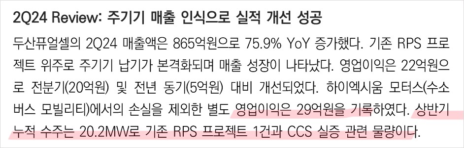 두산퓨얼셀은 최근 수소 연료전지 발전소 프로젝트에서 주요 수주를 따내며 안정적인 매출 성장을 이어가고 있음. 특히 최근에 대규모 프로젝트 계약을 체결하여 향후 실적에 긍정적인 영향을 미칠 것으로 기대됨. 또한, 지속적인 기술 개발로 시장에서의 경쟁력을 더욱 강화하고 있음.