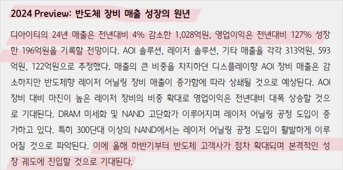 디아이티는 최근 몇 년간 꾸준한 성장세를 보이며 주목받고 있습니다. 특히, 최신 기술 개발과 전략적 파트너십을 통해 시장에서의 입지를 강화하고 있습니다. 주요 계약 상황과 영업 실적도 긍정적입니다. 반도체 장비 성장의 원년!! 가즈아!!