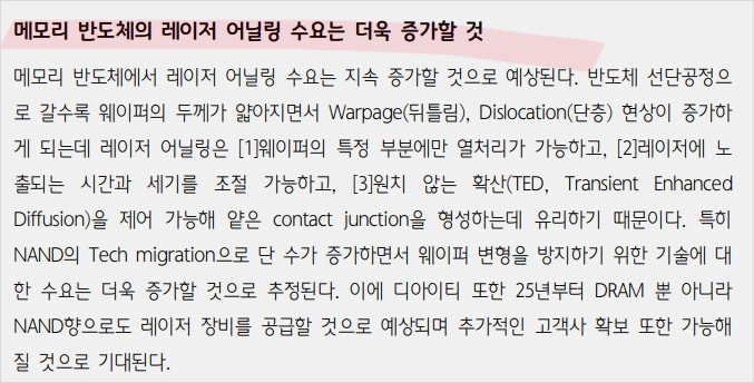 레이저솔루션 비중 확대로 실적 업!! 메모리 반도체 레이저 어닐링 수요 증가!! 캬 하나증권 리포트 오지고요!!