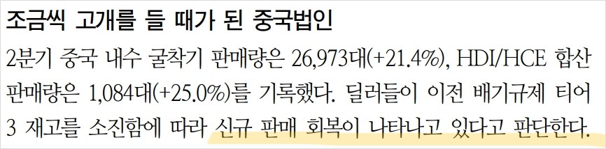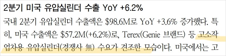 디와이파워는 최근 유압실린더 수출이 증가하고 있으며, 특히 미국 시장에서의 성장이 두드러짐. 미국 수출액은 $57.2M으로 YoY 6.2% 증가하며, Terex(Genie 브랜드) 등 고소작업차용 유압실린더 수요가 지속적으로 증가하고 있음. 또한 멕시코 공장 부지 확보를 통해 북미 주요 업체의 부품 아웃소싱 확대에 대응할 예정임. 중국 내수 시장에서도 굴착기 판매량이 21.4% 증가하며 긍정적인 성과를 보이고 있음.