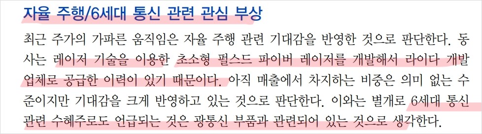• 자율 주행 및 6세대 통신 관련 기대감으로 주가 상승이 예상됨.