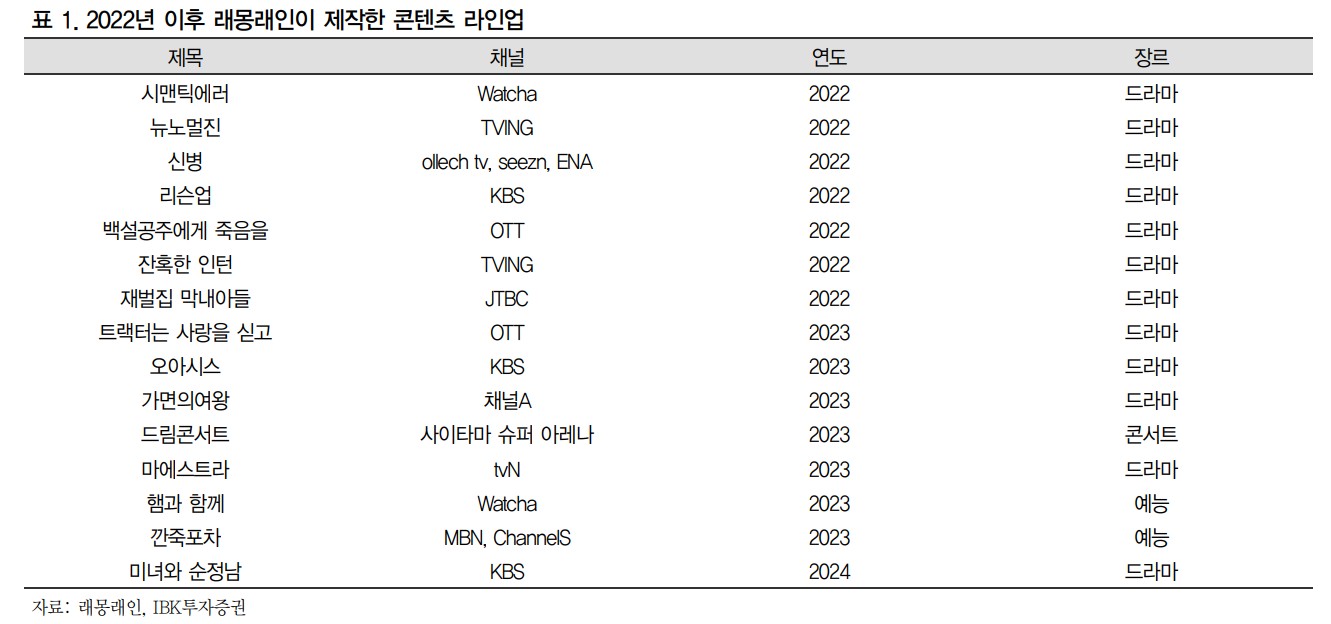 래몽래인은 드라마와 예능 제작을 주력으로 하며, 포트폴리오 다변화와 채널 다각화를 통해 성장 모색 중임. 최근 방송 라인업은 3편으로 제한적이지만, 하반기 예정된 제작편 수와 포트폴리오 다변화를 통해 중장기적으로 성장 가능성이 있음. 회사는 예능 및 오프라인 콘서트를 통해 콘텐츠 포트폴리오를 다변화시키고 있음. 또한 , 유튜브 채널을 통한 고유 IP 재생산 비율을 높이려는 전략도 긍정적으로 평가됨.