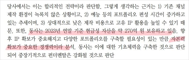 래몽래인은 최근 드라마와 예능 콘텐츠 제작 외에도 오프라인 콘서트와 유튜브 채널을 통한 IP 재생산 비율을 높이려는 전략을 추구 중임. 작년 <깐죽포차>, <드림콘서트> 등을 통해 포트폴리오 다변화를 시도했으며, 현재 유튜브 채널을 통해 기존 IP를 송출 중임. 이는 기존 채널 제작 환경의 어려움을 극복하고, 예능 등의 포트폴리오 편성 시간을 증가시키며, 상대적으로 낮은 제작 비용으로 고유 IP 활용을 높일 수 있는 합리적인 전략으로 평가됨. 회사는 2023년 연말 기준 현금성 자산 약 270억 원을 보유하고 있어 향후 IP 확보와 다양한 포트폴리오 구축에 필요한 자본력도 충분히 갖추고 있음.