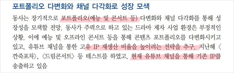 래몽래인은 드라마와 예능 제작을 주력으로 하며, 포트폴리오 다변화와 채널 다각화를 통해 성장 모색 중임. 최근 방송 라인업은 3편으로 제한적이지만, 하반기 예정된 제작편 수와 포트폴리오 다변화를 통해 중장기적으로 성장 가능성이 있음. 회사는 예능 및 오프라인 콘서트를 통해 콘텐츠 포트폴리오를 다변화시키고 있음. 또한 , 유튜브 채널을 통한 고유 IP 재생산 비율을 높이려는 전략도 긍정적으로 평가됨.