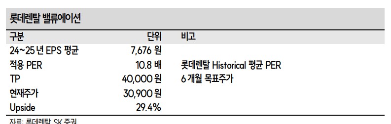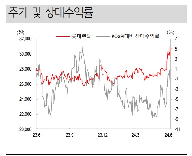 롯데렌탈의 주가는 장기 렌터카와 중고차 렌탈 부문에서의 강세로 인해 긍정적인 전망을 보임. 목표 주가는 40,000원으로 설정되었으며, 이는 현재 주가 대비 약 29.4% 상승 여력이 있음. 장기적인 성장이 기대되는 종목임.