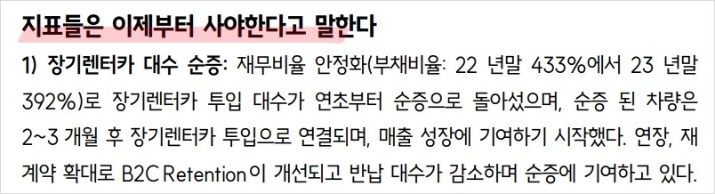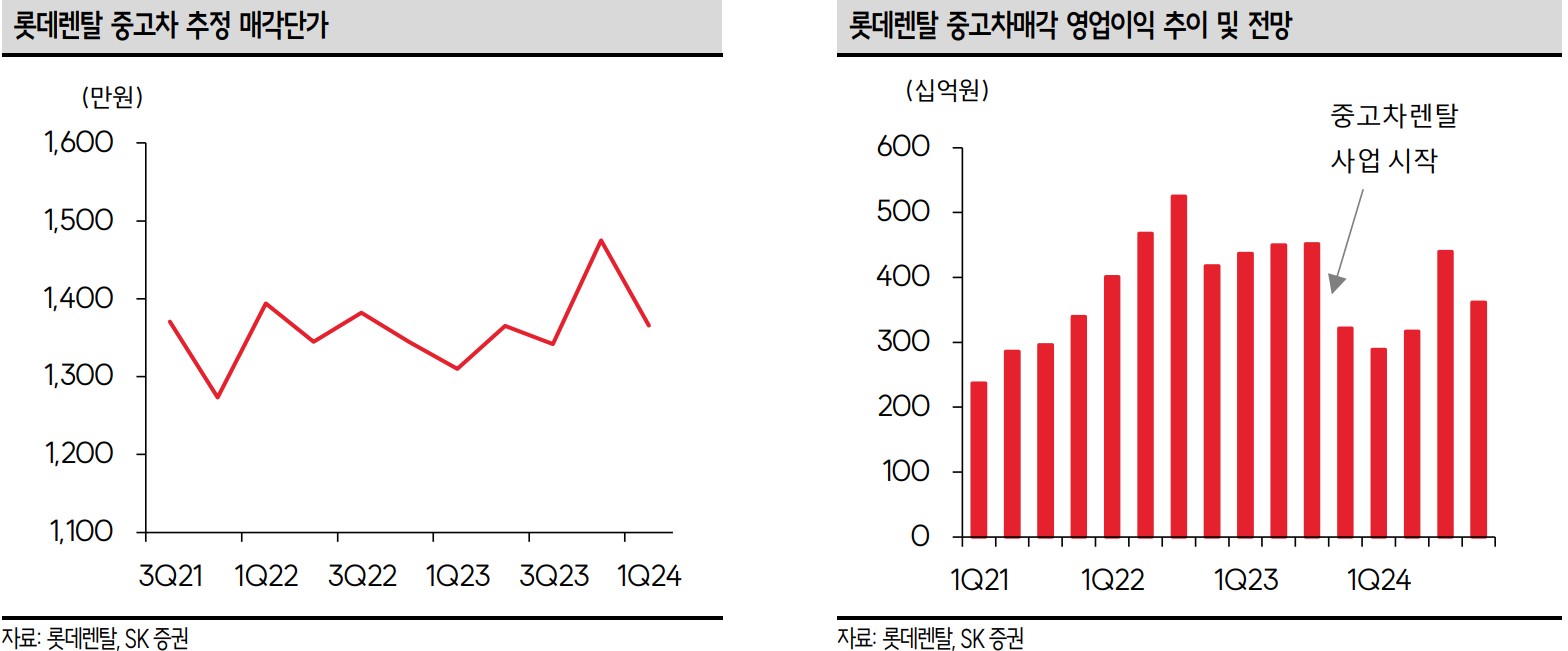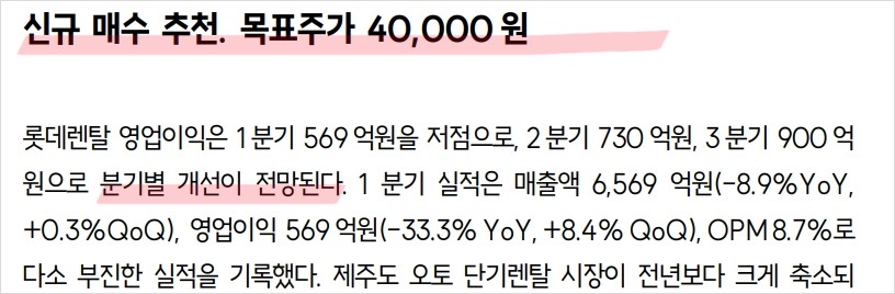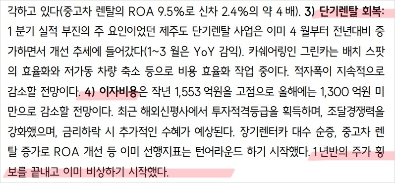 롯데렌탈은 1분기를 저점으로 실적이 회복되고 있으며, 장기 렌터카와 중고차 렌탈 부문에서 긍정적인 전망을 보이고 있음. 그럼에도 나는 투자를 추천하지 않음. 롯데가 묻은 애들은 쳐다도 보지 말라고 했음. 롯데는 신사업보다는 기존 사업 강화를 유지하는 친구들임. 흠. 본 글은 투자 권유글이 아님.
