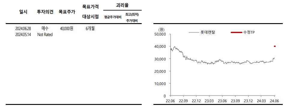 롯데렌탈의 목표 주가는 40,000원임. 이는 현재 주가 대비 약 29.4% 상승 여력이 있으며, 장기 렌터카와 중고차 렌탈 부문에서의 강세를 반영한 수치임.
