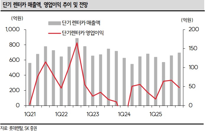 롯데렌탈은 최근 몇 가지 주요 이슈가 있음. 첫째, 1분기 영업이익이 569억원으로 전년 대비 33.3% 감소했지만, 이는 제주도 단기렌탈 사업 부진과 중고차 매각 이익 감소에 기인함. 둘째, 2분기와 3분기 영업이익은 각각 730억원과 900억원으로 회복될 전망임. 셋째, 장기 렌터카와 중고차 렌탈 부문에서 강세를 보이고 있으며, 단기 렌탈 부문도 회복세를 보이고 있음. 넷째, 글로벌 투자적격등급 신용등급을 획득하여 이자비용 감소가 예상됨.
