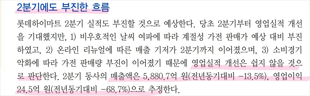 롯데하이마트는 최근 실적 부진에도 불구하고, 하반기부터 실적 개선이 기대됨. 오프라인 점포와 온라인 매출 모두 개선될 것으로 보이며, 펀더멘탈도 강화될 것으로 전망됨. 주가는 향후 긍정적인 흐름을 보일 것으로 예상됨.