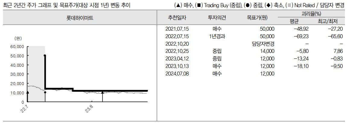 롯데하이마트의 목표주가는 12,000원으로 설정됨. 이는 향후 12개월 내에 달성 가능할 것으로 전망됨. 근데 나는 이 목표주가를 믿을 수가 없음. 10년 간 1/10토막 난 주식인데 이게 어떻게 다시 올라갈까? 라는 생각이 들었음.