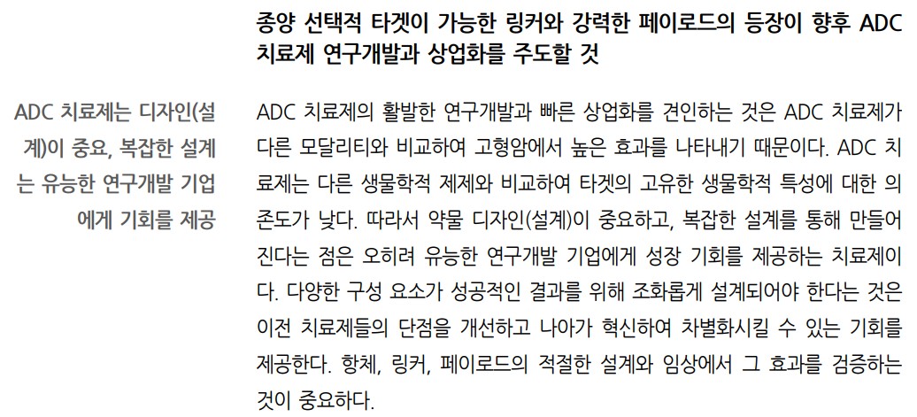 순위를 매긴다면 여전히 치료 계수를 높일 수 있는 주요 요인인 링커의 혁신 성에 가장 관심을 가지는 것 같다. 전통적인 페이로드 외에 면역조절제를 이용한 분야도 관심은 많지만 아직 너무 이른 단계이다. 세번째로 중요한 것은 새로운 타겟이다. 기술이 개선되면 성공할 가능성이 더 높아질 수 있다.
