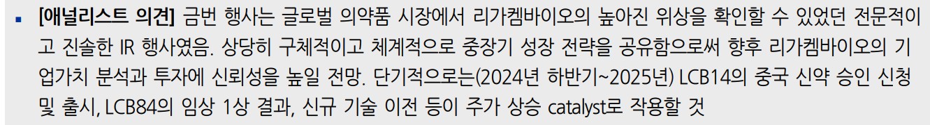 리가켐바이오는 글로벌 R&D Day를 통해 발표한 중장기 전략과 LCB14, LCB84 등의 파이프라인 성공 가능성으로 인해 주가 상승이 예상됨. 특히, 중국 내 신약 승인 신청 및 글로벌 임상 결과 발표가 주가 상승의 주요 요인으로 작용할 전망임.