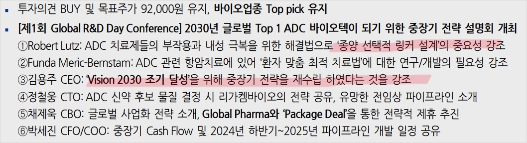 리가켐바이오는 최근 글로벌 R&D Day를 통해 2030년까지 글로벌 Top 1 ADC 바이오텍이 되기 위한 중장기 전략을 발표했음. 주요 발표 내용으로는 종양 선택적 링커 설계, 환자 맞춤 최적 치료법 연구 개발, 중장기 Cash Flow 및 2024년 하반기~2025년 파이프라인 개발 일정 등이 있음. 특히 LCB14의 중국 신약 승인 신청 및 출시, LCB84의 임상 1상 결과, 신규 기술 이전 등이 주가 상승의 주요 촉매로 작용할 전망임.