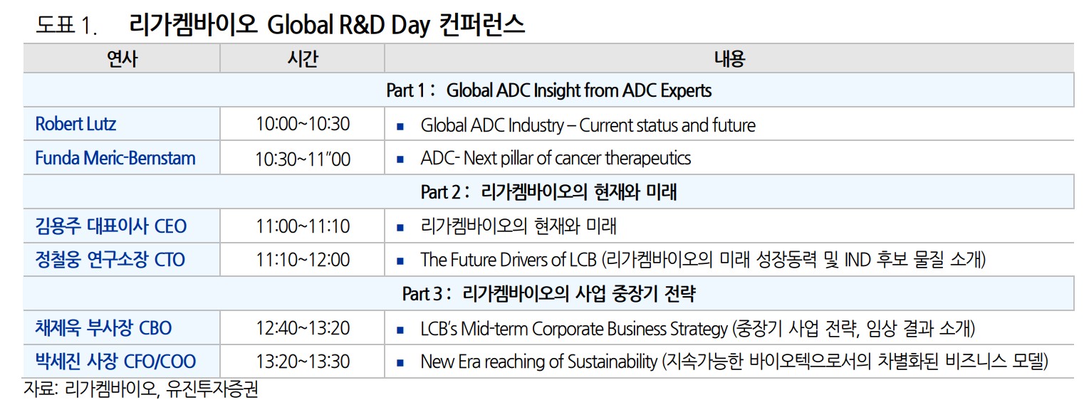 최근 리가켐바이오는 제1회 Global R&D Day를 통해 중장기 전략을 발표함. 주요 내용으로는 LCB14의 중국 신약 승인 신청 및 출시, LCB84의 임상 1상 결과 발표 등이 있음. 또한 신규 기술 이전 및 글로벌 사업화 전략을 통해 향후 기업 가치를 극대화할 계획임. 리가켐바이오는 ADC 치료제 연구개발 분야에서 선도적인 위치를 차지하고 있으며, 글로벌 의약품 시장에서의 위상을 확인할 수 있었음.