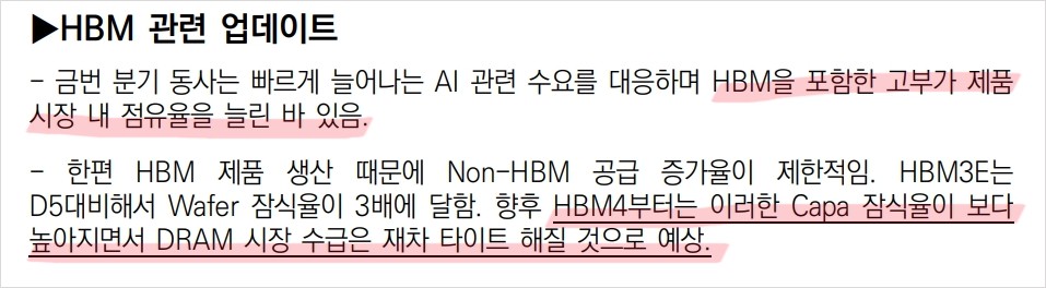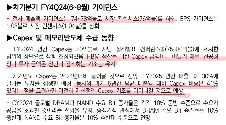 다만, SK하이닉스, 삼성전자 등 유수의 기업들이 HBM메모리에 뛰어들고 있는 만큼 HBM의 단가도 곧 하락할 것으로 보이는데 마이크론이 HBM생산을 위한 시설투자금액을 더 늘리고 있다는 점은 Risk임. 만약 HBM메모리 수요가 하락하거나 가격이 떨어질 경우 문제가 생길 수 있음.