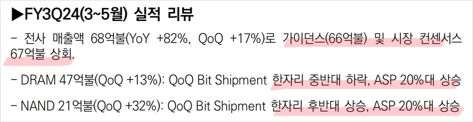 마이크론 테크놀로지 실적 리뷰를 보면 가이던스 및 시장컨센서스 69억불(약 9조 5000억원)상회. DRAM은 하락했으나 ASP는 20% 상승, NAND 한자리 후반대 상승, ASP20% 상승 뭐 이 정도면 실적은 굉장히 잘 나온 것 같은데 주가는 떨어졌음.