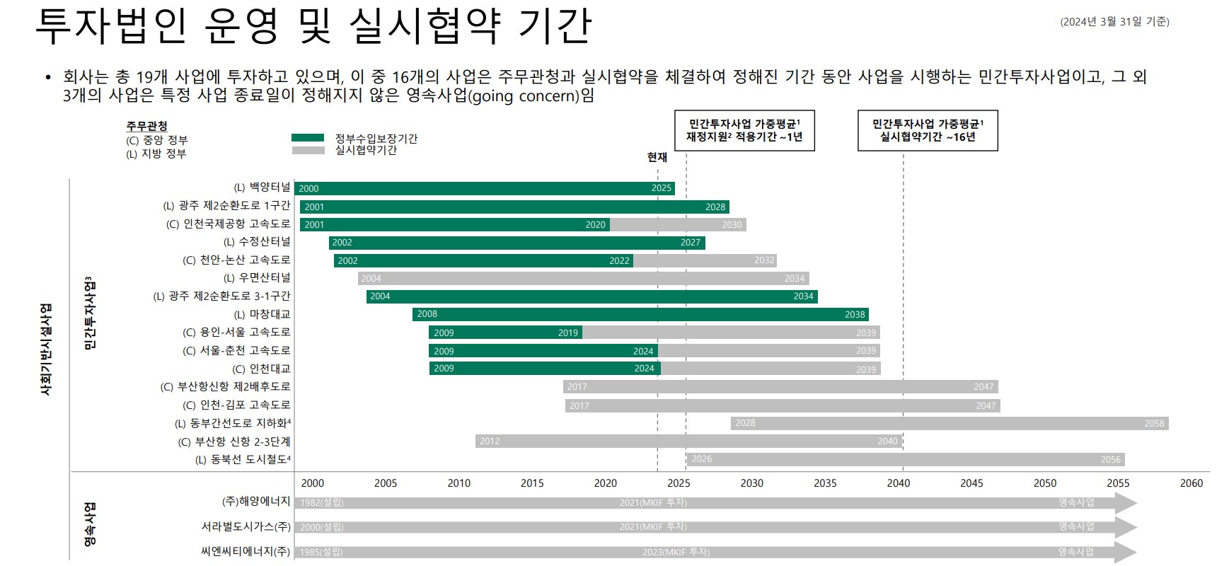 투자기간을 보세요. 2055년까지 거의 모든 투자 기간이 꽉꽉 채워져 있습니다. 멀리 볼 것도 없이 2030년까지 대부분의 투자자산이 그대로 유지됩니다. 초록색으로 표시된 투자자산은 정부수입보장기간이라고 해서 정부가 수익을 보장해주는 사업이라 더 좋습니다.
