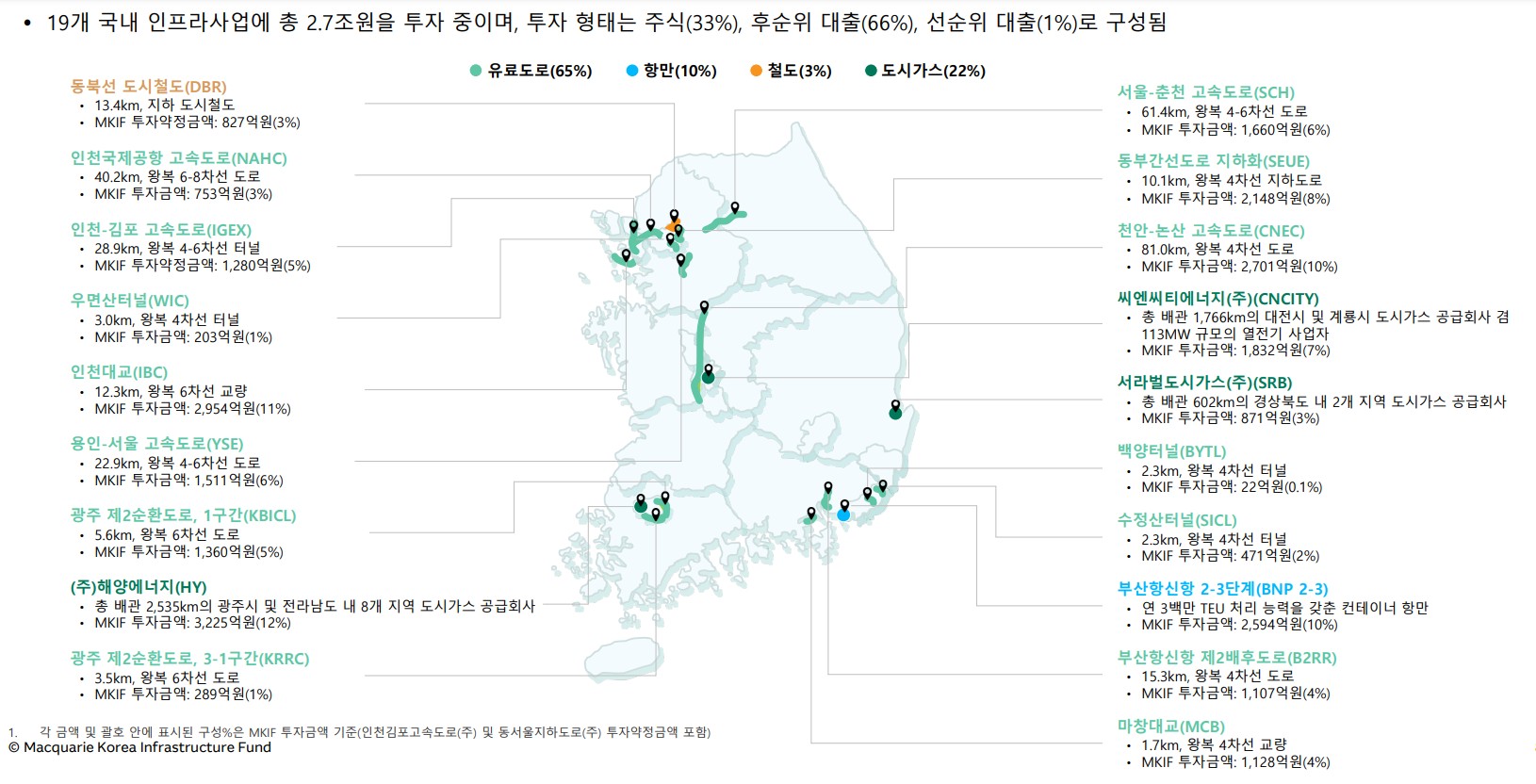 흔히들 삼성전자나 현대차를 보고 한국이 망하지 않는 이상 이들 기업도 망하지 않는다고 하죠? 그런데 정말로 망하지 않는 기업은 따로 있는데 바로 맥쿼리인프라입니다(사실 기업은 아니지만). 맥쿼리인프라가 망한다는 것은 한국이 망했다는 겁니다. 왜냐고요? 맥쿼리인프라는 한국의 인프라에 투자하거든요.
