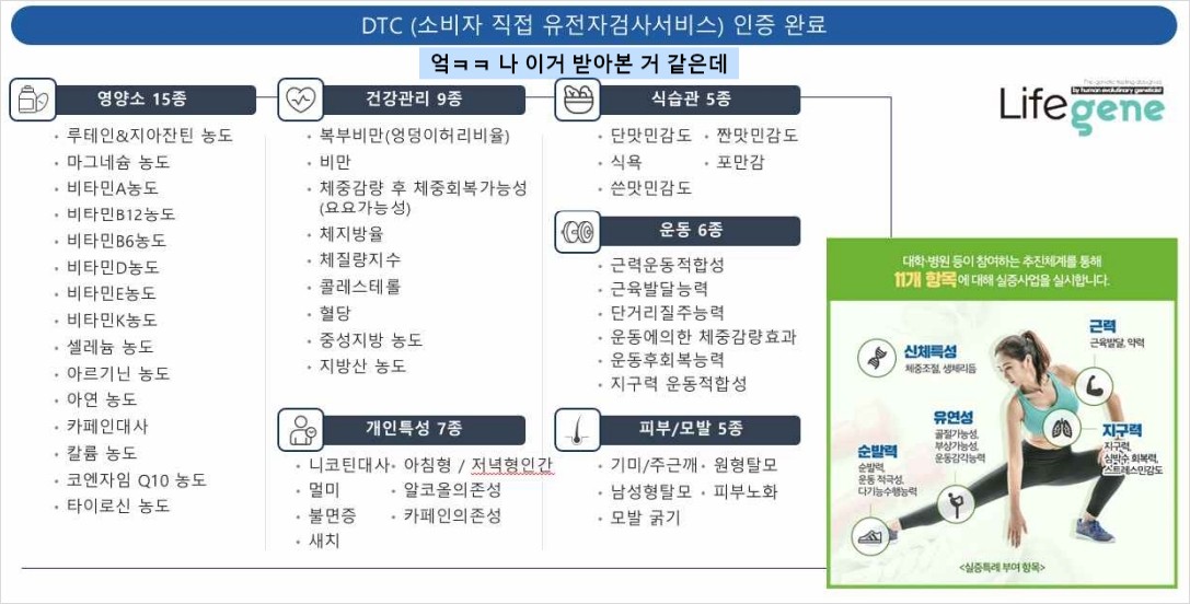 - DTC 건강 유전체 분석 서비스: 영양소, 운동, 피부/모발 등 다양한 항목 분석