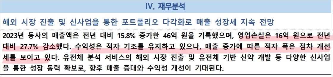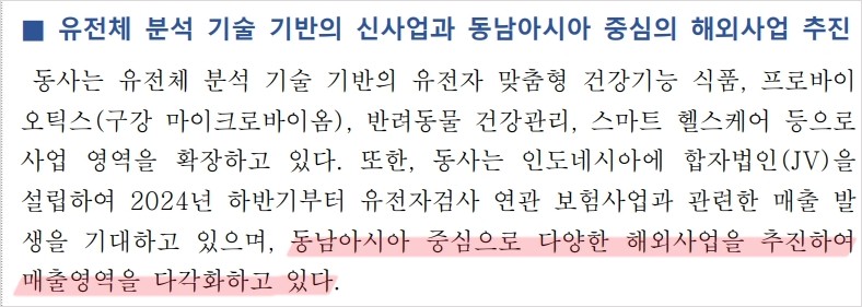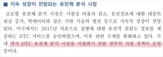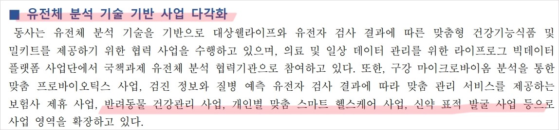 - 기본적 분석: 유전체 분석 기술을 활용한 맞춤형 건강관리 서비스와 다양한 신사업 추진