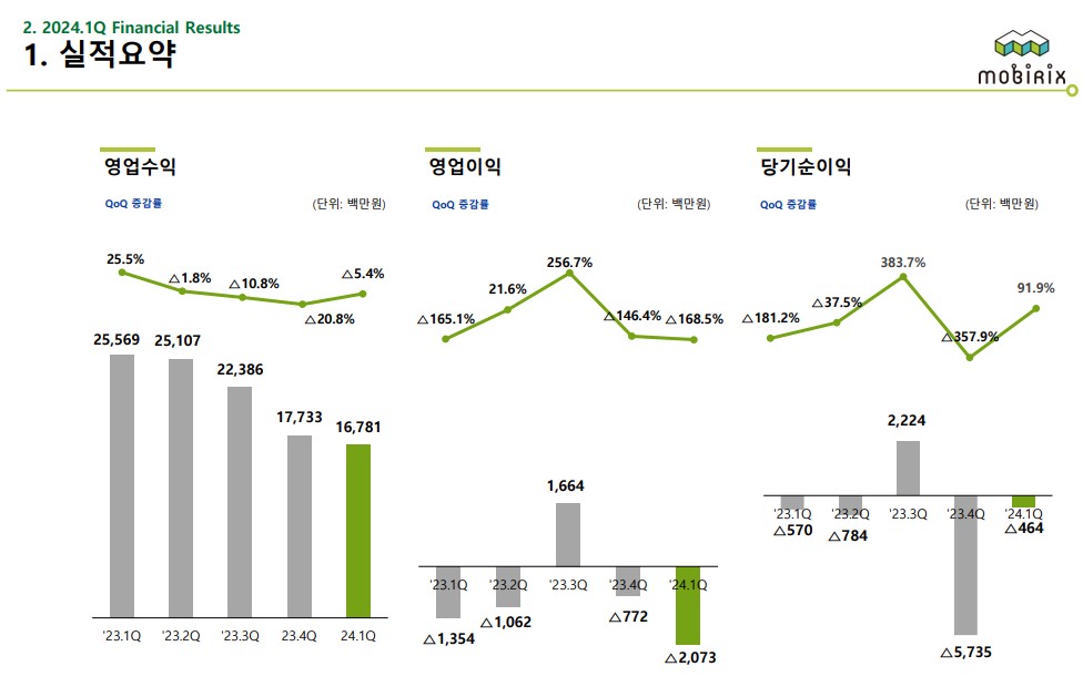 2024년 분기 모비릭스 실적을 보면 영업수익(매출액)도 하락중이고 영업이익은 적자지속.