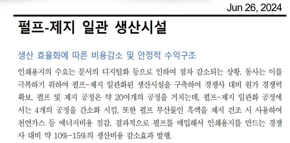 - 펄프-제지 일관 생산체계를 통한 비용 절감