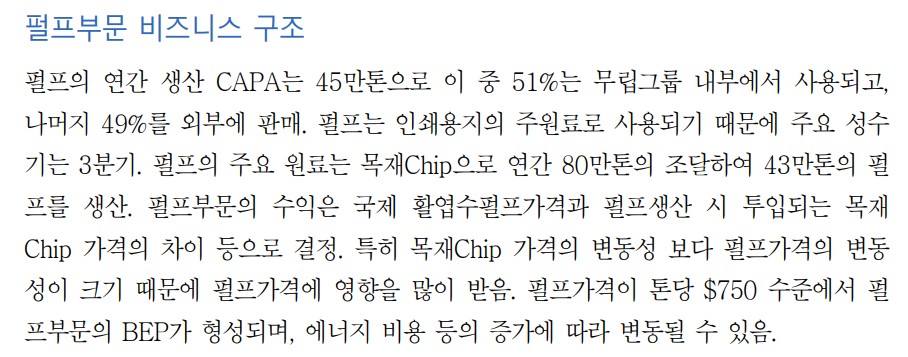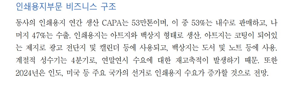 무림P&P는 펄프-제지 일관 생산시설을 통해 비용 절감과 안정적인 수익구조를 확보하고 있음. 인쇄용지와 펄프의 안정적인 수요를 바탕으로 한 성수기 대응과 비용 절감 전략은 기업의 경쟁력을 강화하고 있음. 특히, 2024년 주요 국가의 선거로 인쇄용지 수요가 증가할 것으로 전망됨.